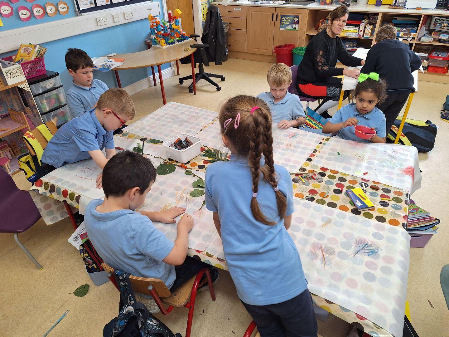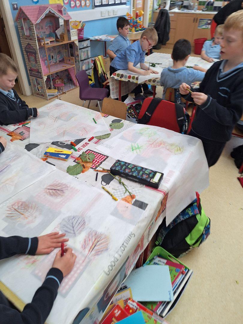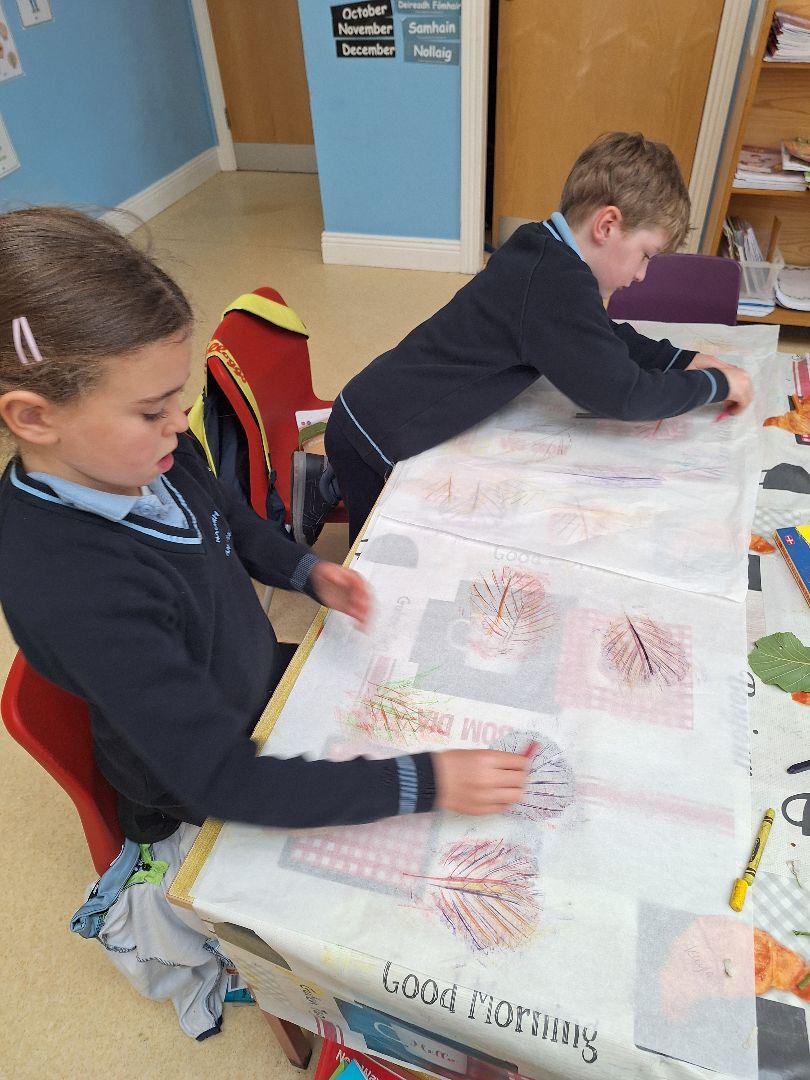 Our local artist Therese Murphy came to the school for an art workshop to create leaf rubbings to display in our church for the Harvest Festival Mass.